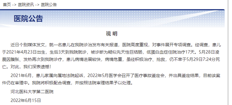 河北医科大学第二医院15日在其官网发布说明:近日个别媒体发文,就一名患儿在我院诊治发布有关报道,医院高度重视,对事件展开专项调查。经调查,患儿于2021年4月23日出生,生后3天到我院就诊,被诊断为疑似先天性巨结肠,低蛋白血症住院治疗17天。5月28日凌晨因腹胀、发热再次到我院诊疗,患儿病情进展较快,病情危重,虽经积极治疗、抢救,仍不幸于5月29日7:24分死亡。对此,我们深表遗憾!