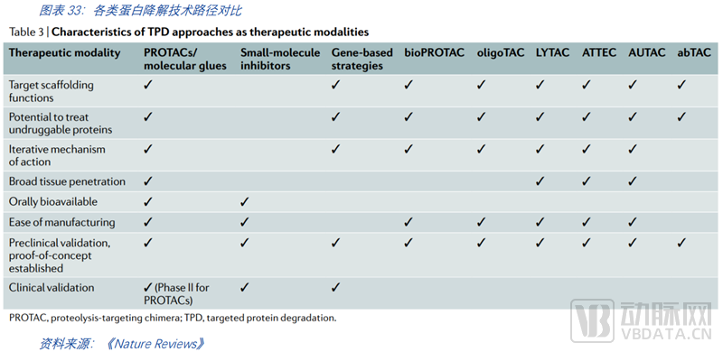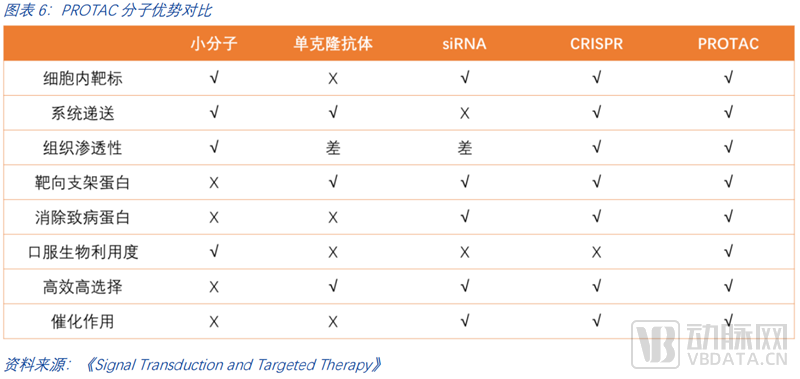 除了以上三大最显著的优势外,PROTAC横向对比其他药物类型,如单抗、核酸药物、DNA药物等,也有显著的综合优越性。一是PROTAC利用蛋白酶体系统从而降解细胞内靶标,而单克隆抗体则难以靶向细胞内的靶标; 二是PROTAC可系统递送,RNA药物的递送仍然存在问题;三是PROTAC有一定的组织渗透性;四是它能够靶向支架蛋白,从而对肿瘤的转移等抑制效果更好;五是它能够清除致病蛋白,传统的小分子药物仅能够抑制蛋白质的活性;六是PROTAC可口服,潜在提升了病人的依从度和药物的可及性,降低了用药的痛苦;七是PROTAC具备高效选择性。PROTAC的泛素化反应需要靶蛋白与E3连接酶保持稳定,这提高了对蛋白的精准选择。例如,多激酶抑制剂Foretinib,可对100余种激酶具有较强的抑制活性(选择性差),而基于Foretinib的PROTAC分子可结合54种激酶(选择性有所提高),但最终仅降解<15种激酶(选择性大幅提高)。潜在的高选择性降低了药物的毒副作用,患者的耐受力将大幅提升。八是PROATC具备一定的催化作用,其PROTAC分子可反复循环使用,这意味着小剂量即有潜力实现较好的降解效果,降低潜在由药物剂量累积导致的毒副作用。