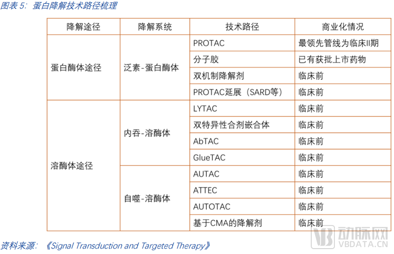 蛋白靶向降解利用人体内天然存在的两大蛋白降解系统:蛋白酶体系统和溶酶体系统实现对致病蛋白的高效精准降解。基于这两大蛋白降解系统,现有多种技术路径开展相关研究并进入临床,最为人所熟知的是PROTAC和分子胶。