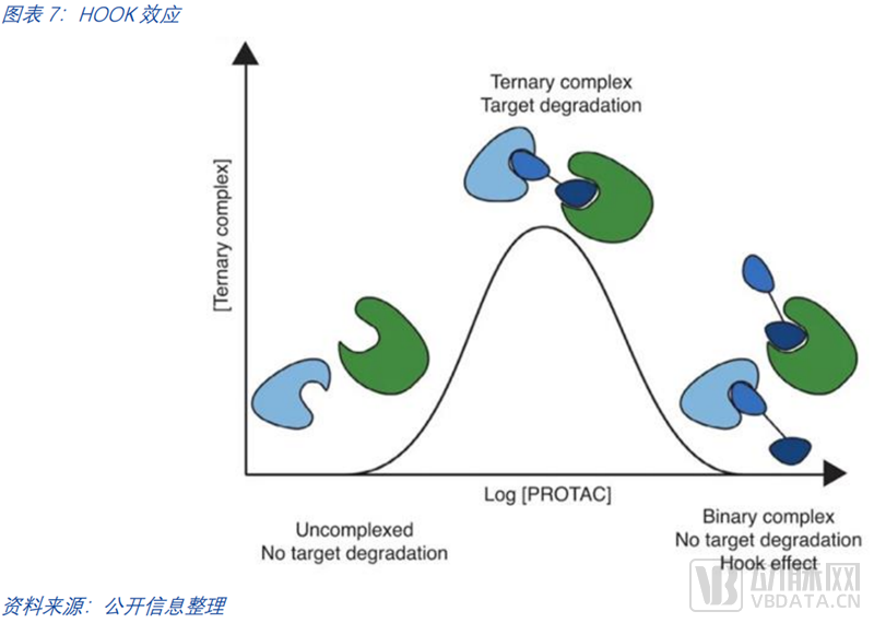 PROTAC的挑战除了其分子自身,在降解过程中也有许多需要实践探知的细节。尽管PROTAC领域取得了许多关键进展,但降解过程、降解靶向性、脱靶效应的理解仍不算全面。在降解过程中,三元复合体的形成也存在困难,PROTAC分子浓度较高时会产生HOOK效应,PROTACs会同靶蛋白和E3酶分别形成复合物,而无法与靶蛋白和E3酶一起形成三元复合物。