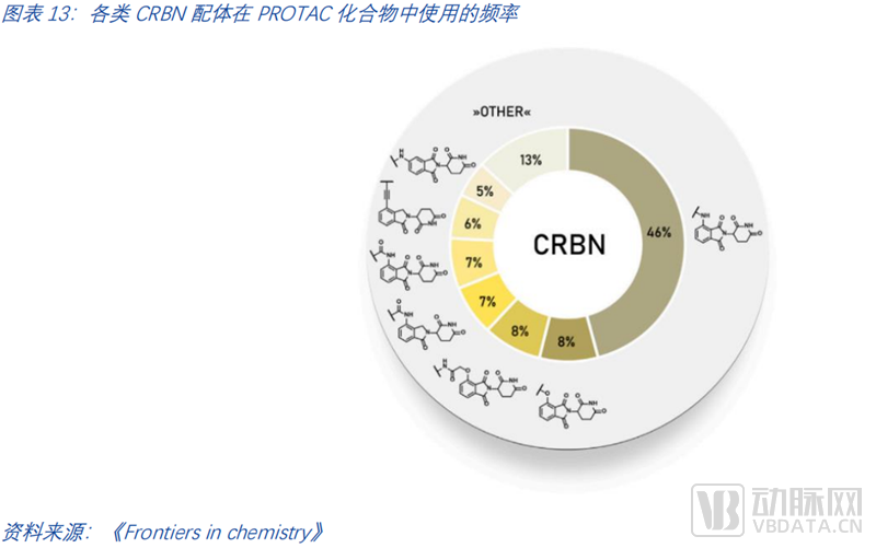 E3连接酶配体是PROTACs最关键的构成部分。大多数PROTAC仍然使用CRBN或VHL作为E3连接酶。CRBN配体常用的有三类。一是基于泊马度胺的配体,二是基于4-羟基酞胺的配体,三是基于来那度胺的配体。由PROTAC-DB数据统计,截至2021年PROTAC化合物中使用的各种CRBN配体频率如下图所示。