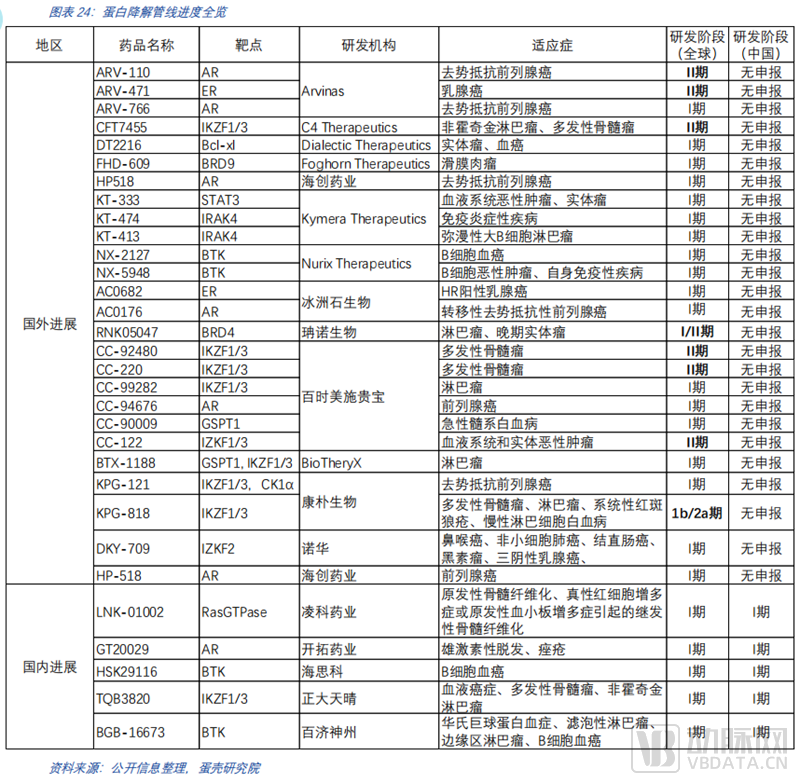 截至2022年5月不完全统计,全球共有临床阶段蛋白降解药物约31个。从进入临床的靶标来看,集中度很高。靶点的选择上多在有临床验证的靶点,策略较为稳健。管线布局研发方式中,以创新药公司自研为主,大药企合作为主的方式布局。
