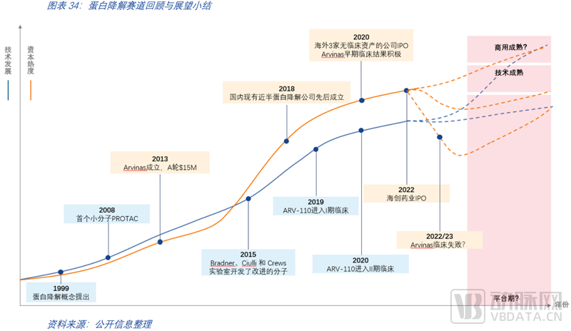 2015年以前,靶向蛋白降解并不为人所熟知,资本的参与也极弱。2015年改进的分子发布后,人们对蛋白降解的关注度迅速提升。无论是科研端还是产业端,都积聚了许多的资源投入在这个领域,许多蛋白降解公司如雨后春笋般快速崛起。回顾国内公司的布局情况,现有近半的优秀的小分子创新药公司都是在2018年前后成立的。2020年,海外三家公司(C4、Kymera、Nurix)收获了IPO,那时候这三家公司还均没有临床资产。2022年,国内的蛋白降解第一股海创药业迎来了IPO。自2015年至今,蛋白领域的资本热度已快于技术进展,这也为蛋白降解领域孵化了更多的优秀公司,助力更多的前沿技术更快推进。第一款药物ARV-110正处于II期临床中,可以预见的是,未来蛋白降解领域的发展将很大程度取决于首批药物的临床结果。无论走向如何,可以确定的是任何一个领域的巨大成功和它背后的颠覆式技术离不开多年的研究积累和无数的波折失败。