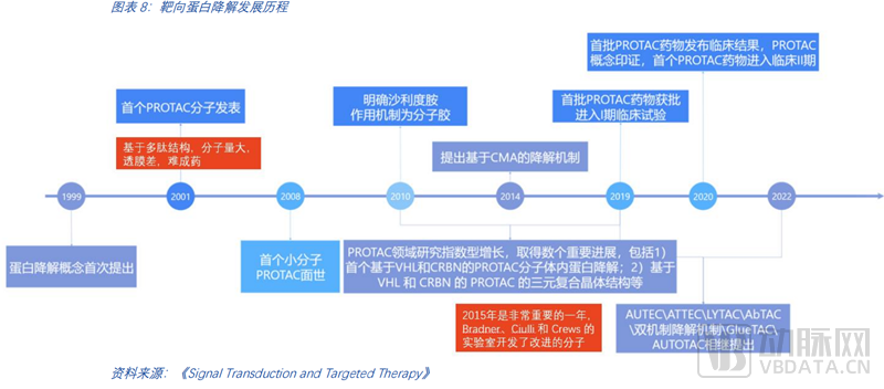 如今,PROTAC已从科研过度到理性设计,进入后概念验证时代。其他技术路径尚处于前期探索阶段。以PROTAC为代表的小分子蛋白降解发展历程已有超过20年的时间。蛋白降解概念的首次提出始于1999年,随后在2015年的早期临床前工作开发了改进的分子,这是里程式的重要进展。2019年开启了首个临床试验。