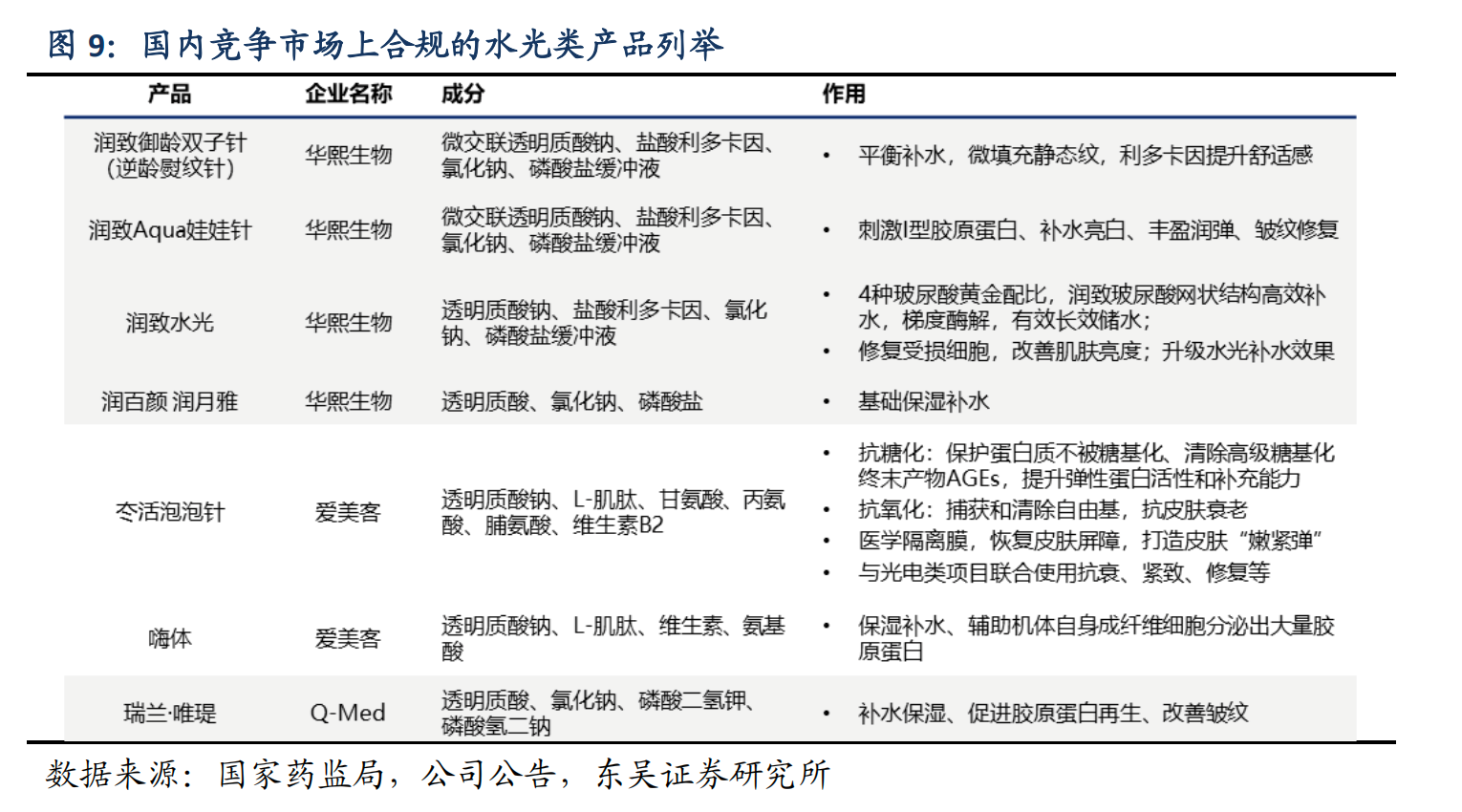 2022 年 3 月,国家药监局正式发布“关于调整《医疗器械分类目录》部分内容”的公告,明确作为“水光针”主要成分的注射用透明质酸钠溶液按照Ⅲ类医疗器械监管。用于注射到真皮层,主要通过所含透明质酸钠等材料的保湿、补水等作用,改善皮肤状态,产品不应含有发挥药理学、免疫学或者代谢作用的成分。而目前医美市场上获得三类器械证的水光针产品尚少,以爱美客、华熙生物上市公司的产品为代表。而其中,例如爱美客嗨体、冭活泡泡针这类含营养素的水光针更加稀缺。在政策监管趋严之下,医美机构正逐步转向使用正规持证产品,这将为爱美客、华熙生物等公司产品带来可观的增量空间。