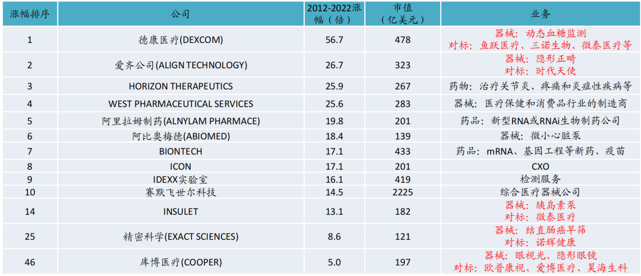 过去10年(2012/01/01-2022/01/01)年美股诞生了一批消费医疗牛股,整个医药板块(100亿美元市值以上)涨幅最大的公司德康医疗、 爱齐公司皆为消费医疗公司,分别上涨了57、27倍,此外,INSULET、精密科学、库博医疗等消费医疗公司也分别上涨了13、9、5倍。