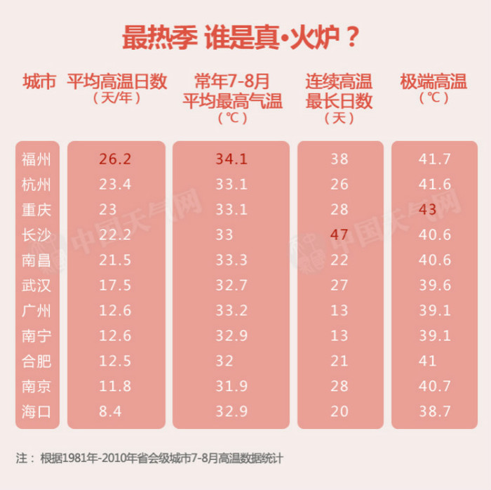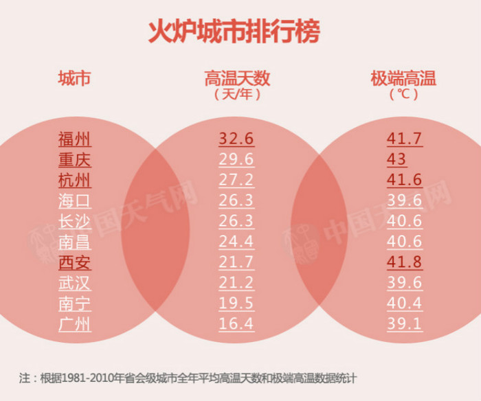 单从高温天数来看,福州、重庆、杭州、海口排在前面,是高温最多的4个“火炉”。而从极端高温来看,重庆以43℃领先全国,堪称国标版“火炉”,其中西安则是当之无愧的成为北方“火炉”。