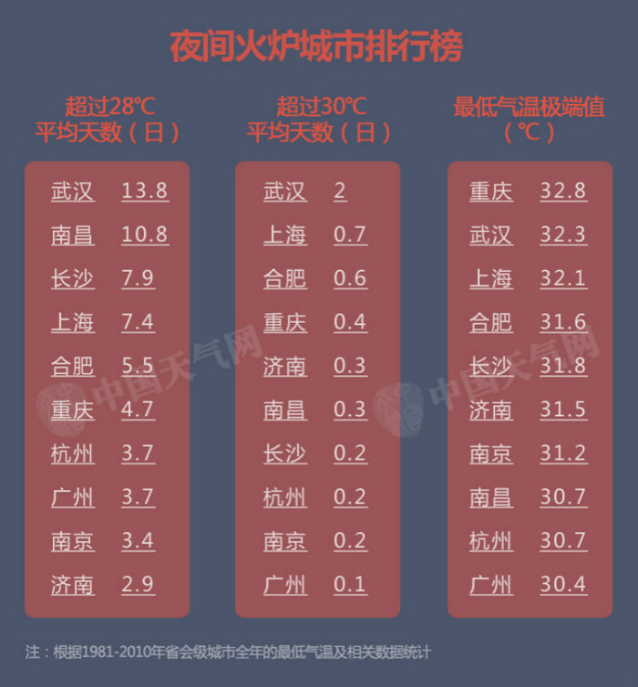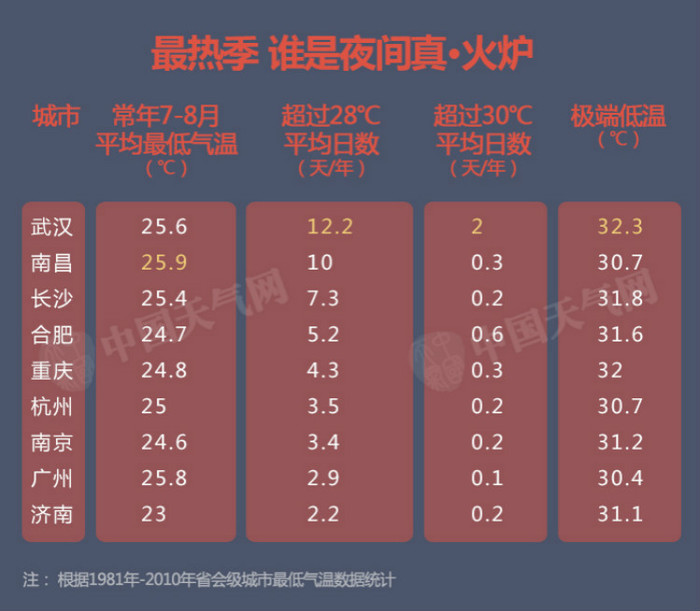 从最低气温的统计来看,在7、8月份,武汉、南昌平均每年都会有10天甚至更长体验到28℃以上的最低气温,都是夜间“火炉”的典型代表。