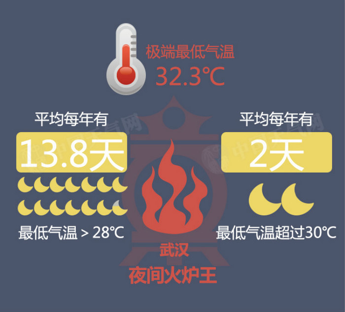 其中武汉以13.8天/年登顶首位,而且,武汉最低气温超过30℃的情况也时有发生,平均每年会出现2天。尽管武汉白天的高温不算突出,但却是实实在在的夜间火炉王。