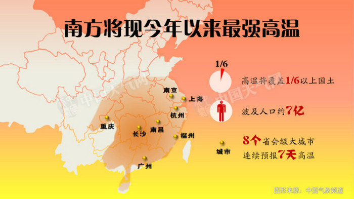 这次高温估计会维持10天以上,上海、杭州、长沙、南昌、福州和重庆的最高气温将不止一天达到37℃,福州和重庆可能出现连续几天最高温达到38℃以上,当然它们也都是“火炉”城市里的老司机了。而上海、南京、南昌的最低气温会在28℃以上,甚至能到30℃,今年初尝夜间火炉的滋味。总之,这轮高温持续时间长,范围广,湿度大,不仅白天热,晚上也不好受,应该是今年来最厉害的一次。
