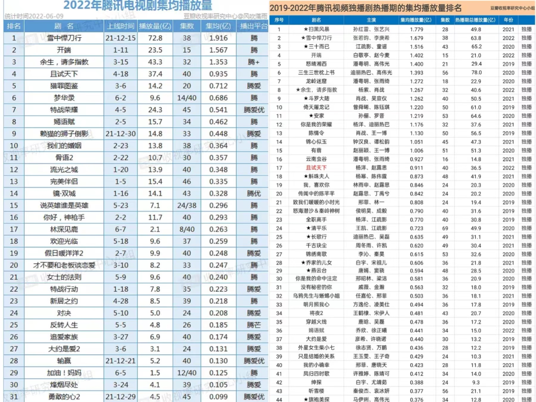 不上星的网播剧就比较麻烦。就在14日晚,腾讯突然取消了播放量,以热度代之。看似走上了爱奇艺、优酷同一个计量体系,但动不动破万的热度值,又让人看不明白。这时候,第三方平台数据就显得重要了,目前各路数据榜单不下十个。比如猫眼、灯塔、云合、骨朵、艺恩、德塔文、Vlinkage等。