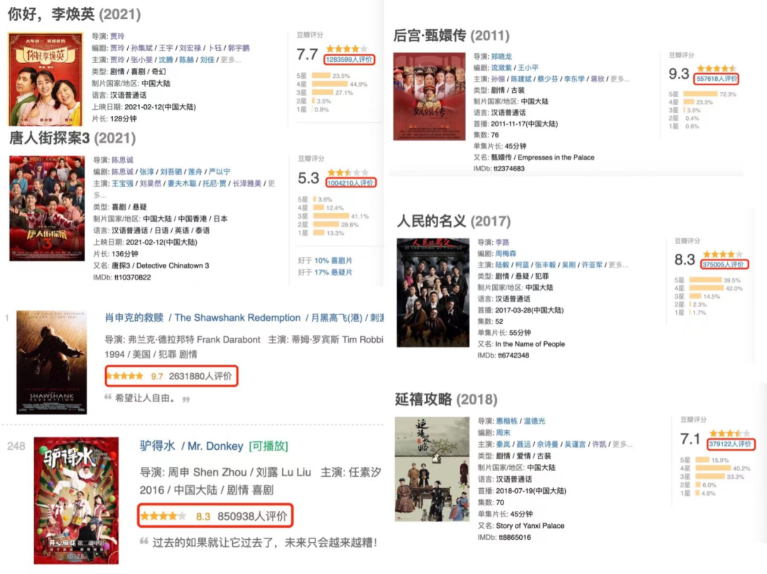 一是因为豆瓣评分的受众定位偏电影,现象级爆剧《甄嬛传》也才55万人打分,连电影《驴得水》的打分人数都比它多,更不用说百万人打分的爆款电影《你好,李焕英》《唐人街探案3》等。样本量不够,路人没有给电视剧打分的习惯,这就让粉丝、黑粉在剧集评分上更有操作空间。