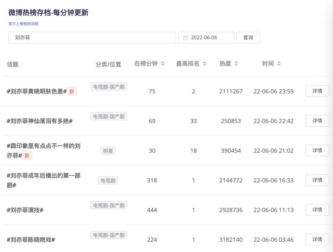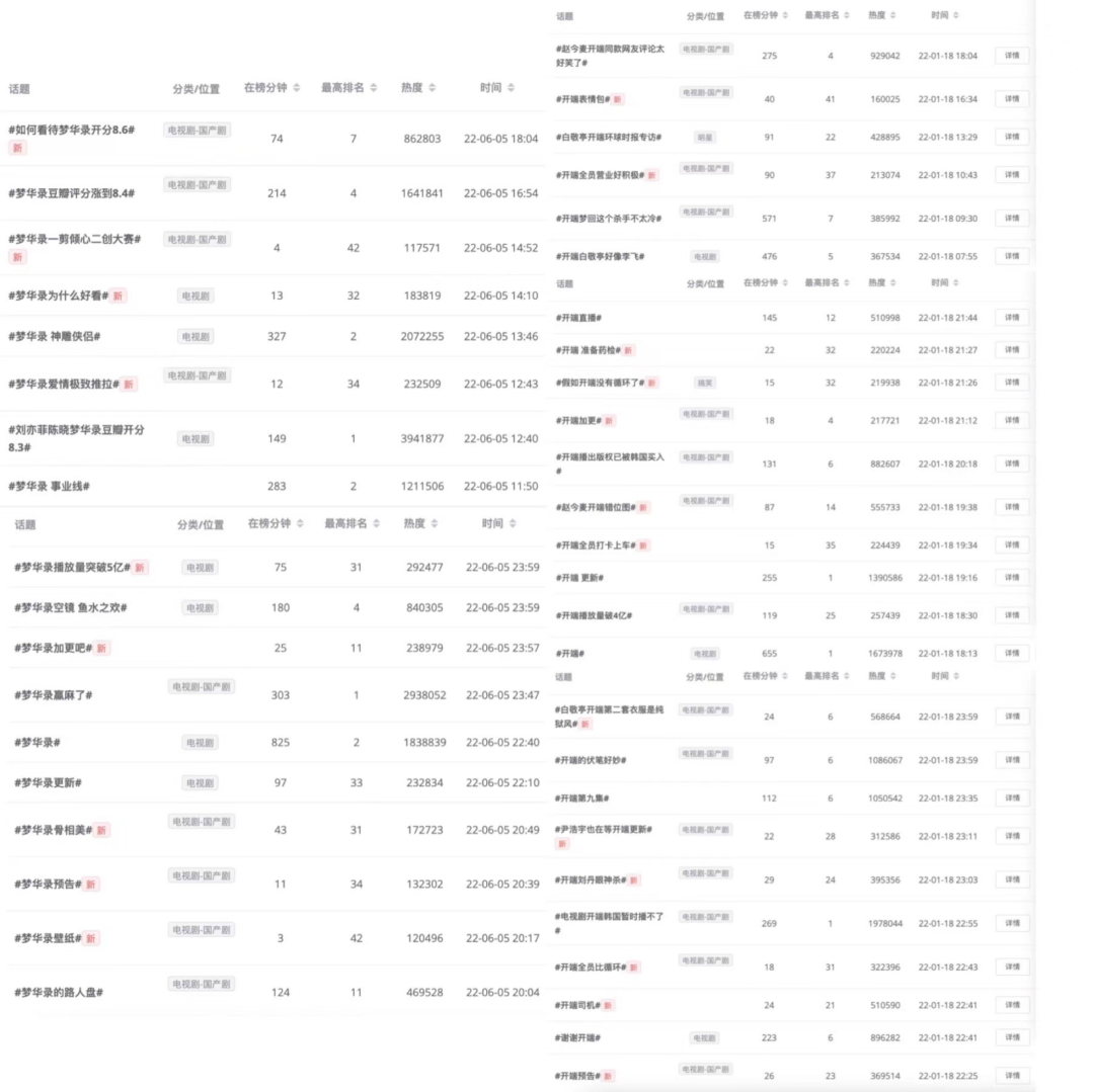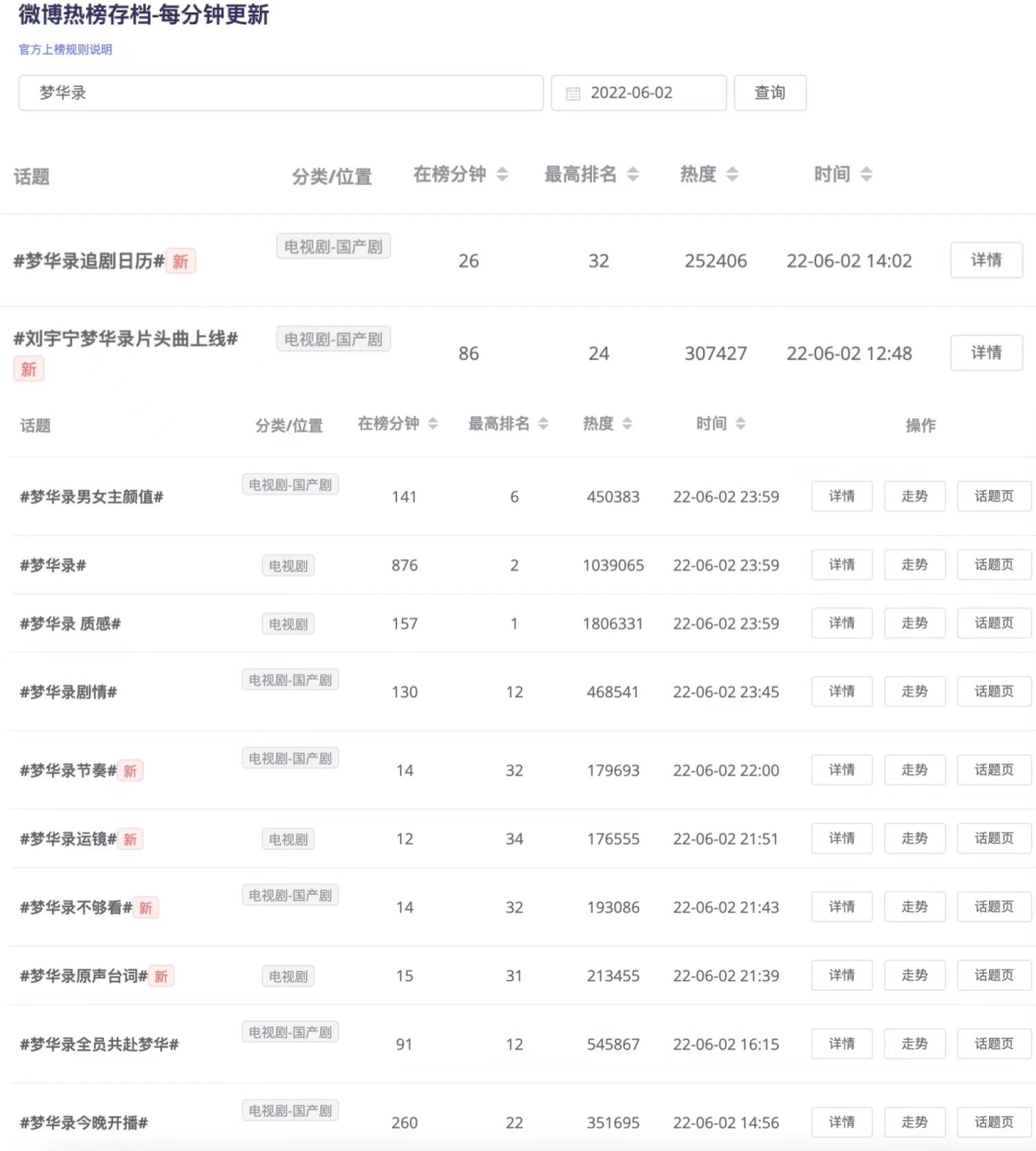6月2日至4日,每天以#梦华录#为关键词的热搜就多达12条,6月5日更是高达18条,加上刘亦菲的单人热搜4条,陈晓的单人热搜2条,单日峰值24条,在今年播出剧集里排第二,仅次于《开端》播出第8日的26条。