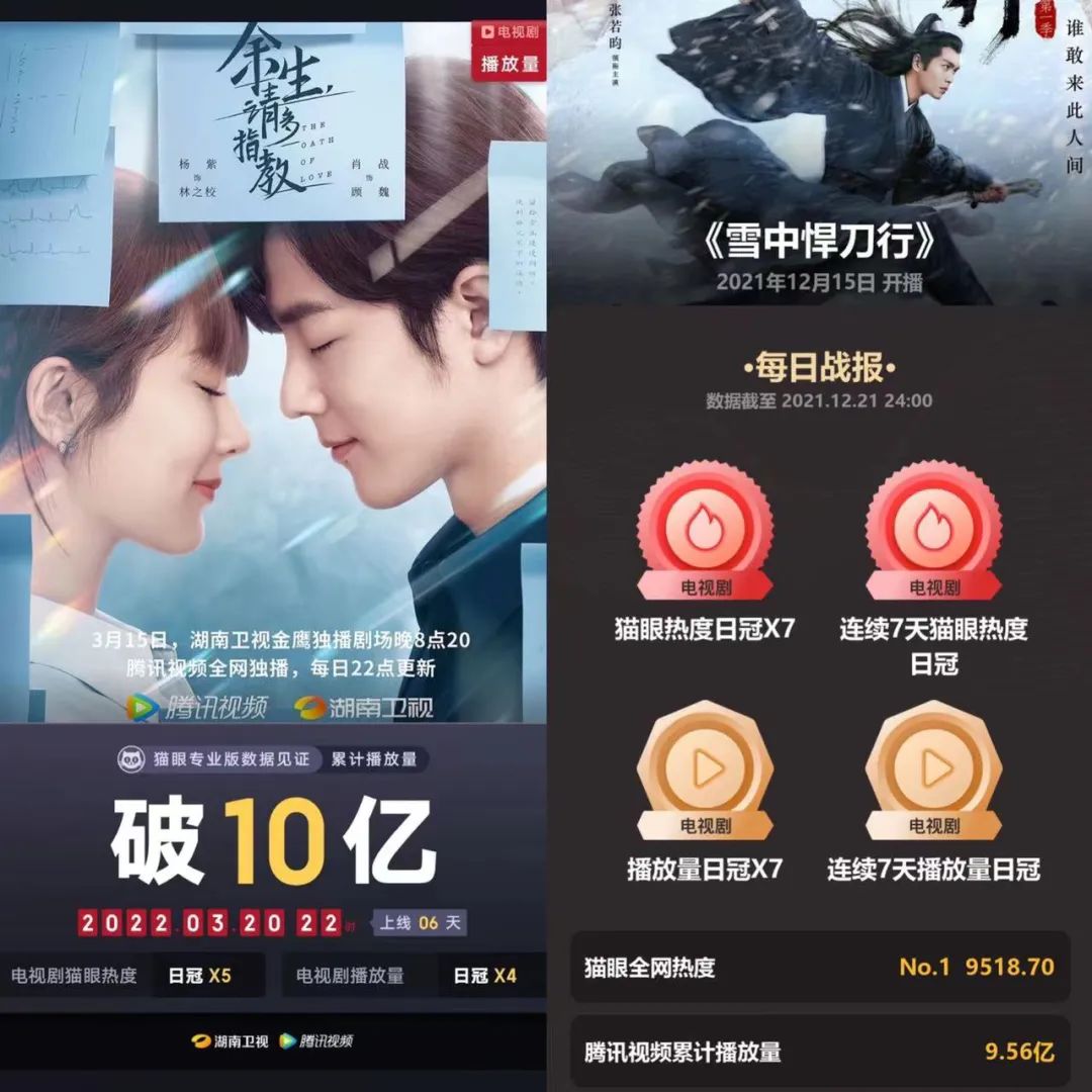 首先,从腾讯视频站内剧的维度来看,《梦华录》首周突破9.4亿播放量的成绩,接近9.5亿播放量的《雪中悍刀行》,次于《余生,请多指教》。虽然播放量突然被取消了,无法评估《梦华录》的后续,但首周成绩还是可以参考。