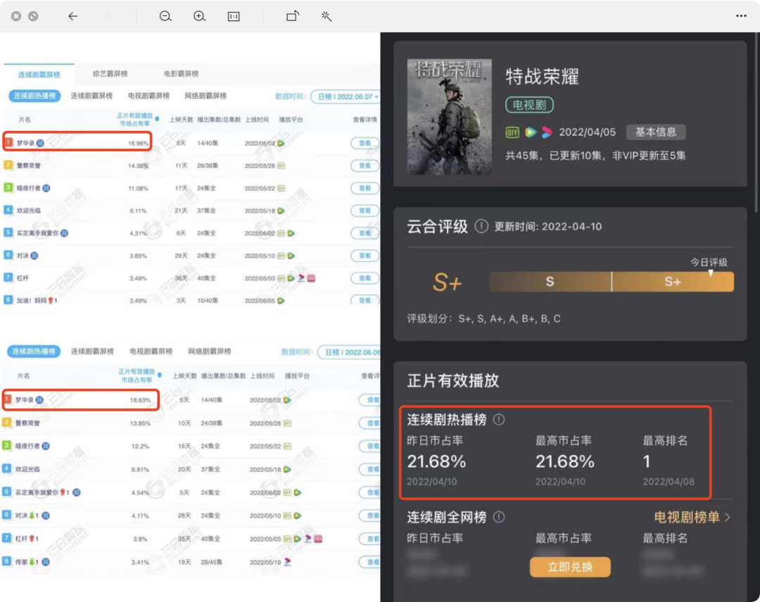 其次,从其他数据榜单来看。《梦华录》猫眼的全网热度连续12日最高,峰值为9888,近期下跌至9300;灯塔的正片播放市占率拿过6次最高;艺恩的播映指数只拿过3次最高;骨朵的全网热度连续12日最高,峰值86,近期下跌至71;云合的正片有效播放市占率峰值20%,与《警察荣誉》相差不到1%。目前首周表现,低于4月播出的《特战荣耀》成绩;