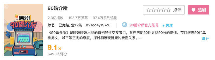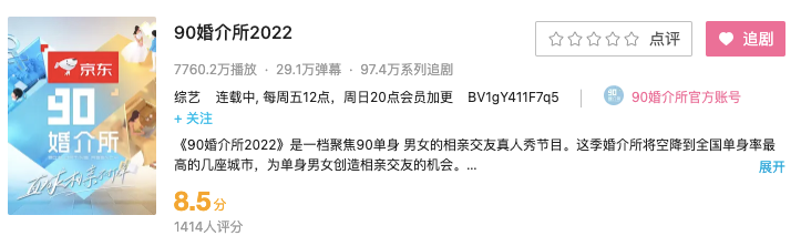 从新综艺的选题来看,B站在自制领域仍然在靠向适合平台自身属性的切入点,即年轻人感兴趣的话题、文化领域,不过从一些细微的地方,比如《90婚介所2022》的节目定位从第一季的“异性交友”变为了“相亲交友”,还是看到了B站想要向更大众市场迈进的期望。