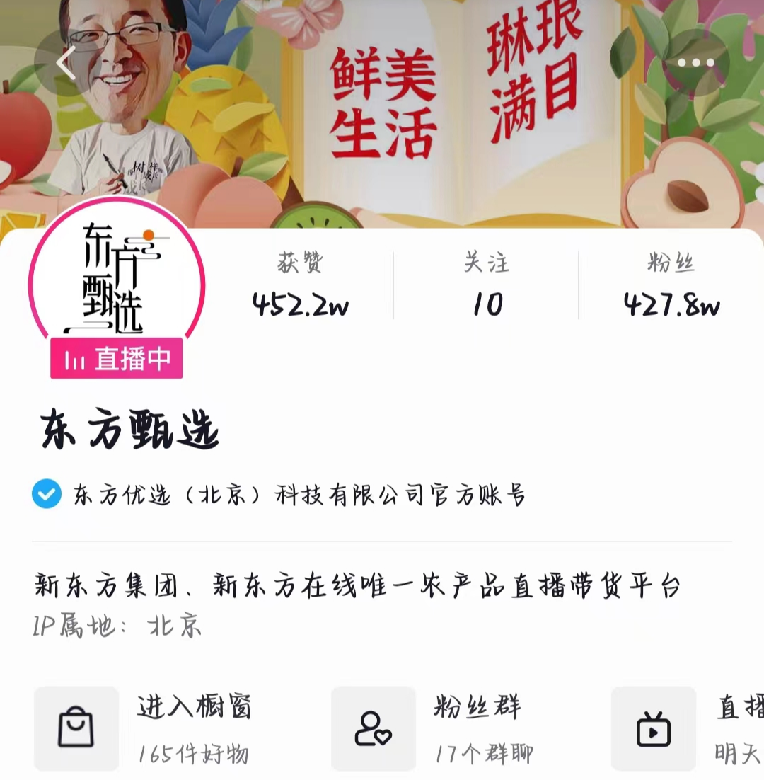 公开资料显示,东方甄选是新东方成立的大型农业直播带货平台。2021年12月28日,俞敏洪在东方甄选同时开启助农直播首秀,直播产品包括生鲜蔬果、粮油干货、乳品零食等多个品类的数十种产品。