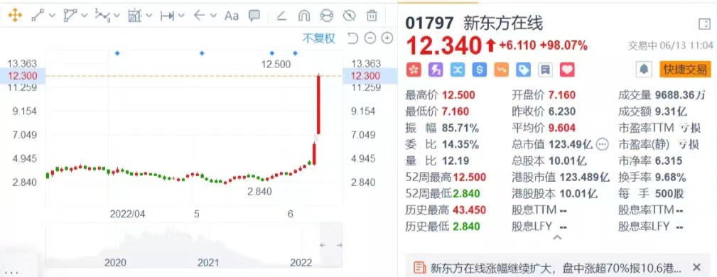 数据显示,6月13日新东方在线日内涨幅超100%,截至当日收盘,港股市场新东方在线每股报价12.5港元,6月涨幅超220%;母公司新东方涨幅则超17%,每股报价16.06港元,盘中最大涨幅为25.47%