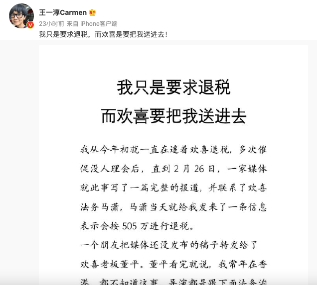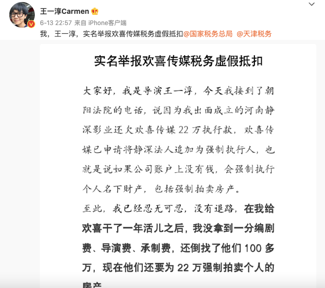 近日,知名影视公司欢喜传媒被导演实名举报“逃税”的事儿登上热搜,引发行业内外的关注,但这瓜吃起来有一些夹生,事情有一些复杂,涉及到专业的税务知识,双方也是各执一词。不过就在6月15日下午,该事件似乎已经落下帷幕,实名举报的导演王一淳在微博上公开服软。