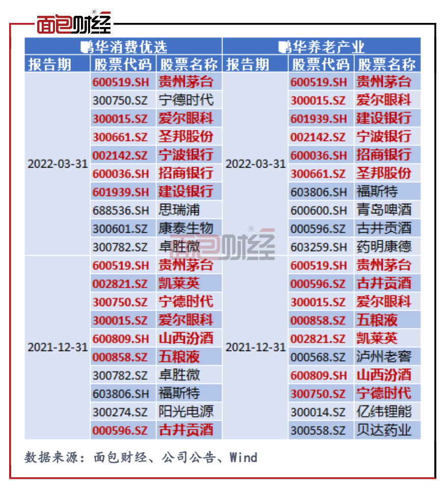 图7:鹏华消费优选、鹏华养老产业近期十大重仓股