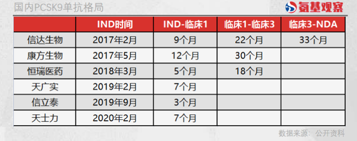 依靠超强的执行能力,信达生物在临床3期的时候,领先其他竞争对手1年时间以上,而这也成为其率先获批的保障。按照信达生物临床3期约33个月的周期计算,那么第二款国产自研的PCSK9单抗获批也将有1年以上的时间差。