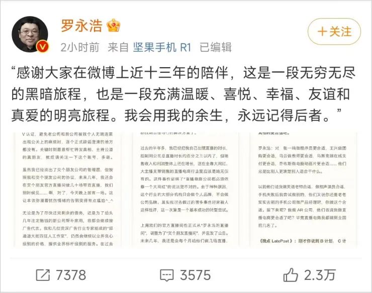 可偏偏在这时,罗永浩选择了离开直播界,只在交个朋友直播间留下个客卿的身份,转头走上了一条在外人看来有些搏命的道路。