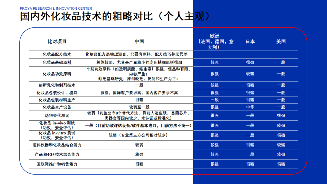 众所周知,国外很多原料公司和品牌公司在学术和技术生态方面逐渐形成自己的技术壁垒;同时相对完整的产业化落地链路和知识产权保护体系,进一步加固了这种壁垒。目前国内相对较强的领域在于包材,近年在功效原料的创新有一定的发展和进步,但整体还是弱于国外,缺少一定的创新研究。