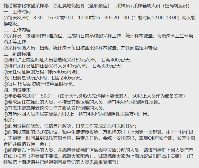 而界面新闻记者在6月中旬以想要应聘核酸采样员为由,咨询了数位徐汇区一街道上岗的采样员,并联系到上海捷诺常态化核酸采样亭在该街道的运营管理陈轩。该街道所有临街常态化核酸采样亭均有国药集团上海捷诺生物负责。