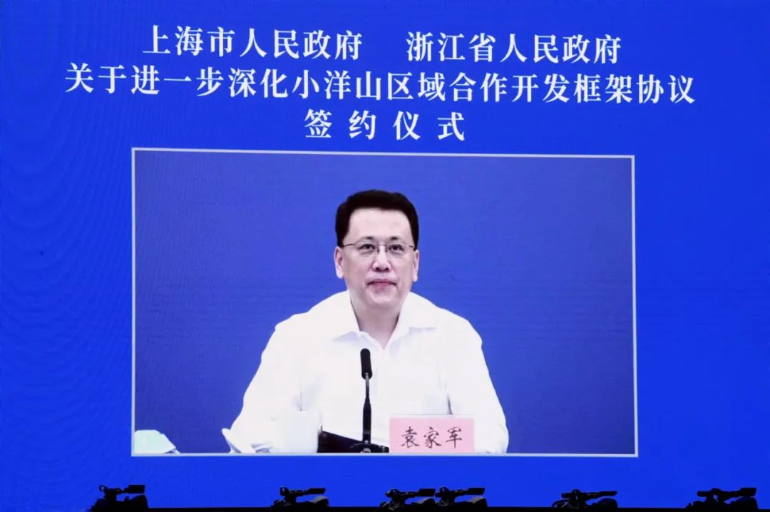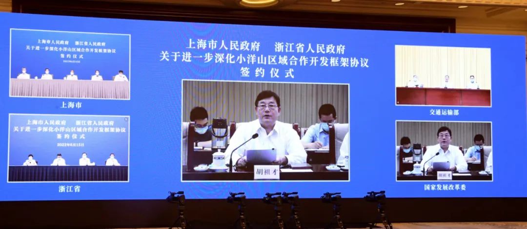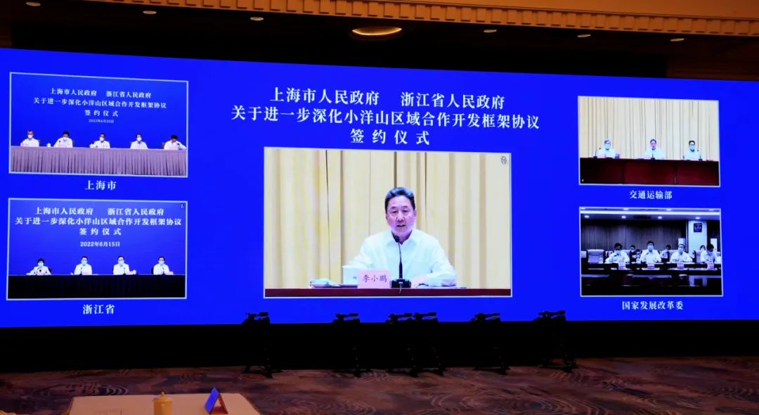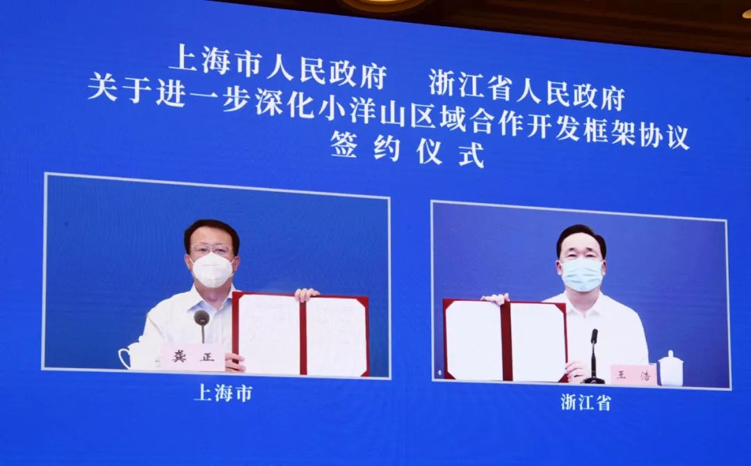 今天下午(6月15日),上海市人民政府与浙江省人民政府以视频连线方式正式签署进一步深化小洋山区域合作开发框架协议。上海市委书记李强、浙江省委书记袁家军和交通运输部部长李小鹏、国家发展改革委副主任胡祖才出席签约活动并讲话。上海市委副书记、市长龚正,浙江省委副书记、省长王浩共同签署协议。