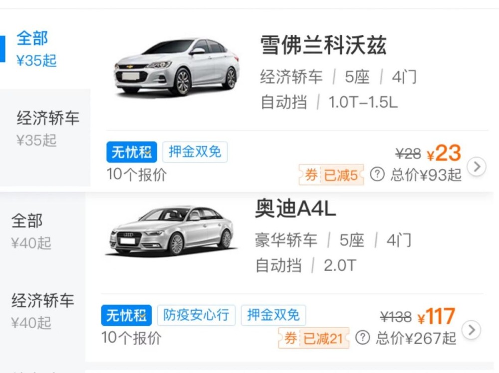 谈擎说AI编辑部的文文同学,前两天租车去参加大学室友婚礼,那天看到价格文文还跟我们吹自己拣着漏了,因为他实际租到的21款奥迪A4L,只要不到120元一天,加上保险服务费一天也才270元。