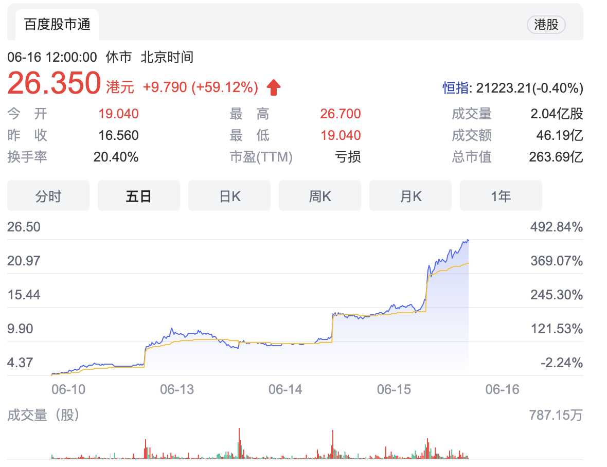 接近40倍的增长也进一步提振了二级市场的信心,6月9日以来,新东方在线股价最高涨超100%。截至6月16日12点,新东方在线股价为26.35港元/股,五日内涨超492.84%;新东方港股股价也最高上涨至21港元/股。