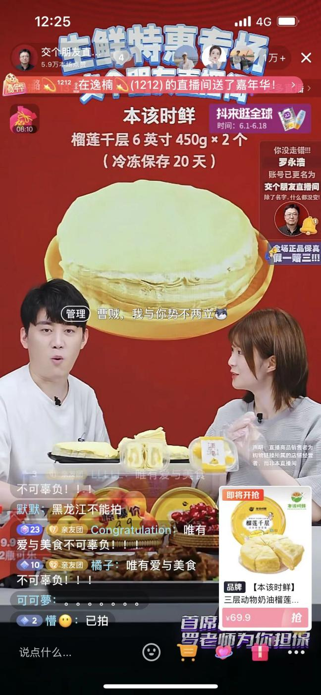 派财经在6月15日午间观察到,交个朋友直播间正在带货一款和东方甄选直播间热卖单品,本该时鲜的榴莲千层。主播李正和王拓,现场扮演起了三国演义中的片段,直播间人气瞬间飙升到了1万+。