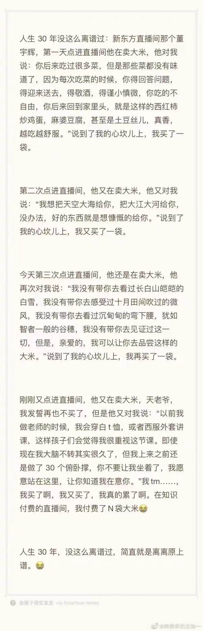 有网友发帖表示,自己一天内四次点进直播间,在董宇辉的真诚感染下,连续买了四袋大米。这个段子在社交媒体平台上被广为流传。