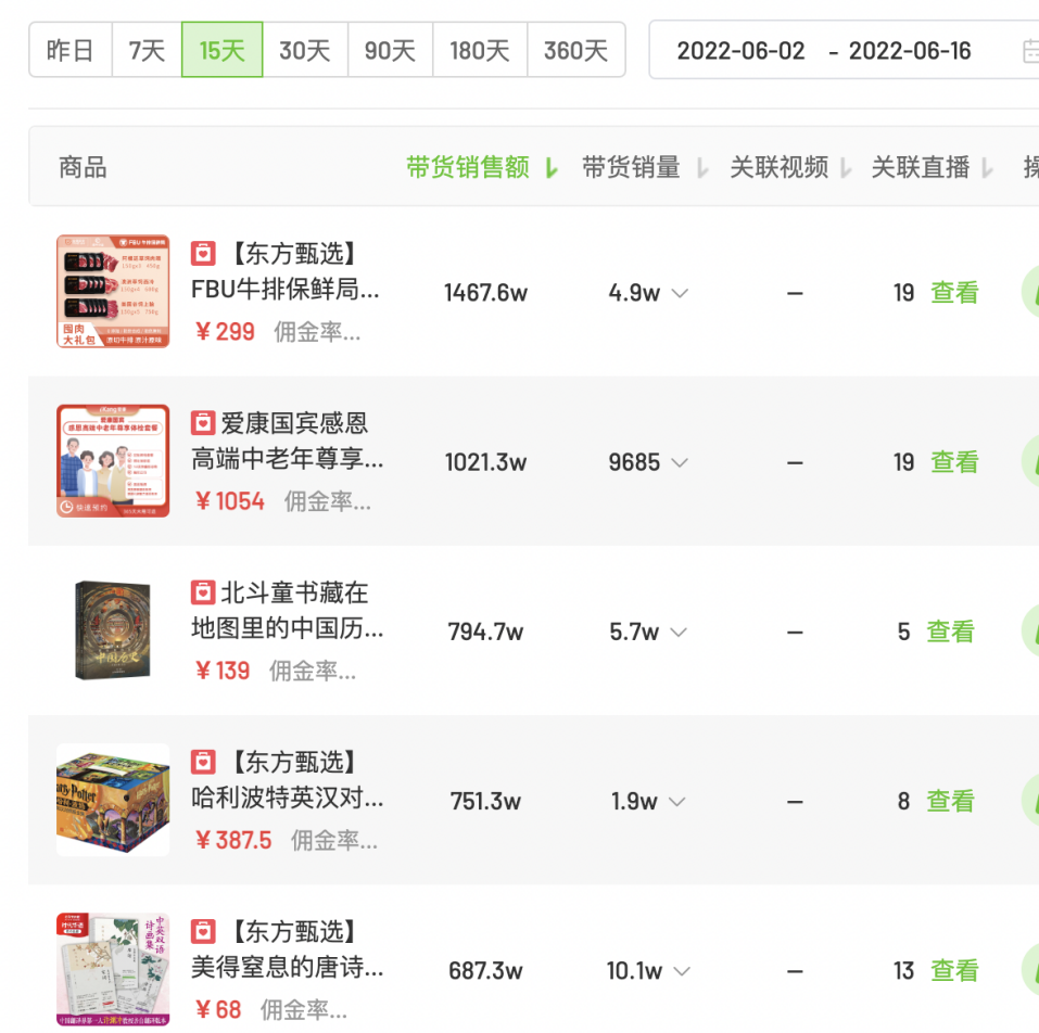 目前来看,图书和生鲜构成了东方甄选直播间内主要的选品方向。有网友反映称,连续多日点进直播间内,都看到主播在卖同样的货品,五常大米、玉米、牛排、虾、DK博物大百科……其中人气最高,印象最深的是伴随着董宇辉走火的那款牛排。飞瓜数据专业版显示,该单品在过去半个月内卖出了1467.6万,关联直播19场。此外,“藏在地图里的中国”和哈利波特英汉双语书籍也卖出了上万套,销售额相加上千万。