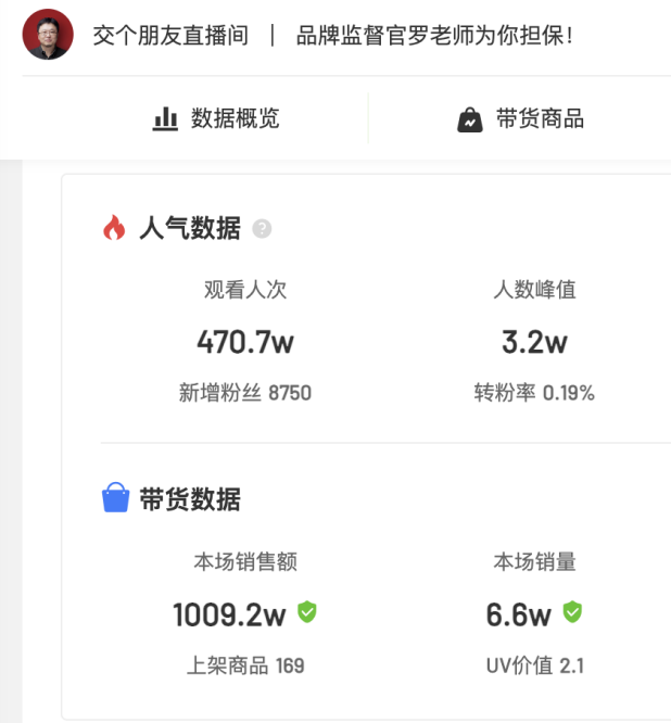 在宣布自己退网后不到24小时,罗永浩出现在了6月13日晚交个朋友直播间,现身带货。作为交个朋友直播间的“流量吉祥物”,每次罗永浩的出现都能将直播间人气带向高潮,当晚人气达到了3.2万,比平日多出两三倍。
