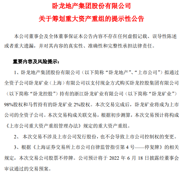 最早在今年1月11日,卧龙地产就提出将收购上海卧龙矿业有限公司(简称:上海卧龙矿业)100%股权。