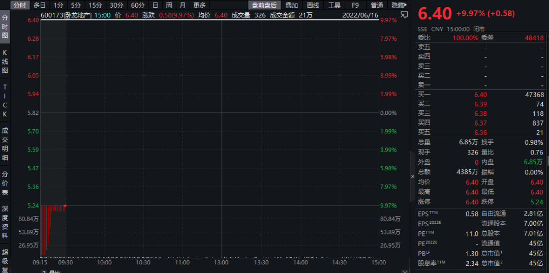 受此影响,6月16日开盘,卧龙地产股价一字涨停。截至当天收盘,卧龙地产股价为6.4元/股,涨幅9.97%,总市值为44.83亿元。