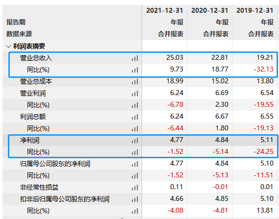 财报显示,2019年-2021年,卧龙地产的营业收入分别为19.21亿元、22.81亿元、25.03亿元,三年连续上涨;但同期,其净利润则分别为5.11亿元、4.84亿元、4.77亿元,持续走低。