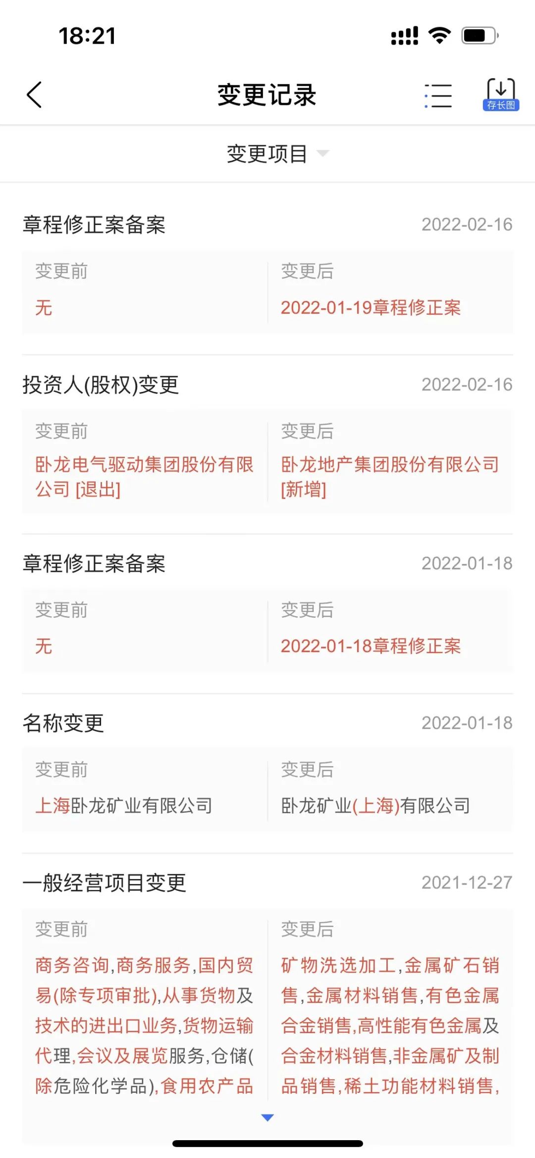 爱企查显示,2月16日,上海卧龙矿业(现更名为“卧龙矿业(上海)”)发生股权变更,卧龙电驱退出,卧龙地产成为新任股东,持股比例100%。