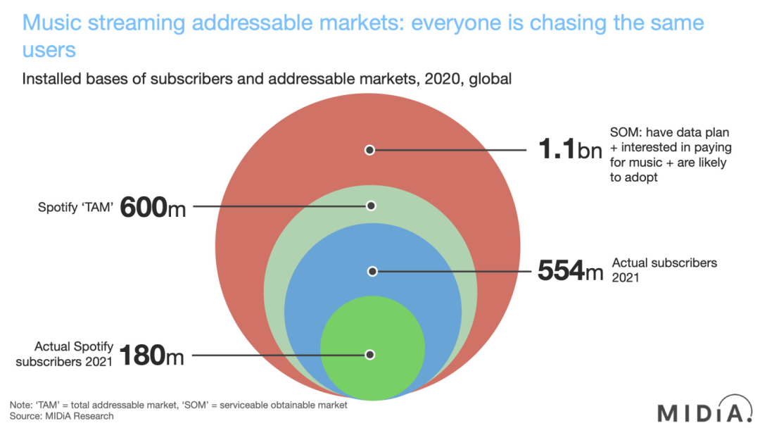 行业分析师Mark Mulligan在文章《为什么TAM只是Spotify故事中的一部分》中指出,仅有TAM是不够的,Spotify还应当考虑到SAM(Serviceable addressable market,可服务的目标市场,即对音乐付费感兴趣的人群)以及SOM(Serviceable obtainable market,可服务的可获得市场,即考虑城市化率、付费能力等因素后的SAM转化)。