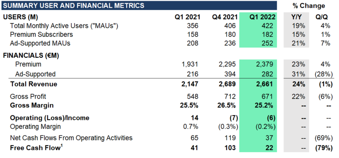 今年第一季度的财报显示,基于拉丁美洲和欧洲市场的出色表现,Spotify全球月活跃用户 (MAU) 达到4.22亿,环比增长1600万。按照这个环比增速速度,会发现Spotify要在8年后月活达到10亿,确实不是空穴来风。