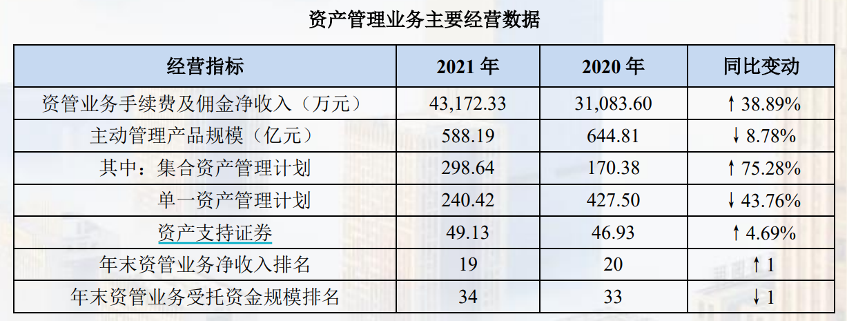 行业排名方面,资管业务受托资金规模排名较2020年下降1名至34名,资产管理净收入排名提升1位达到行业第19位。