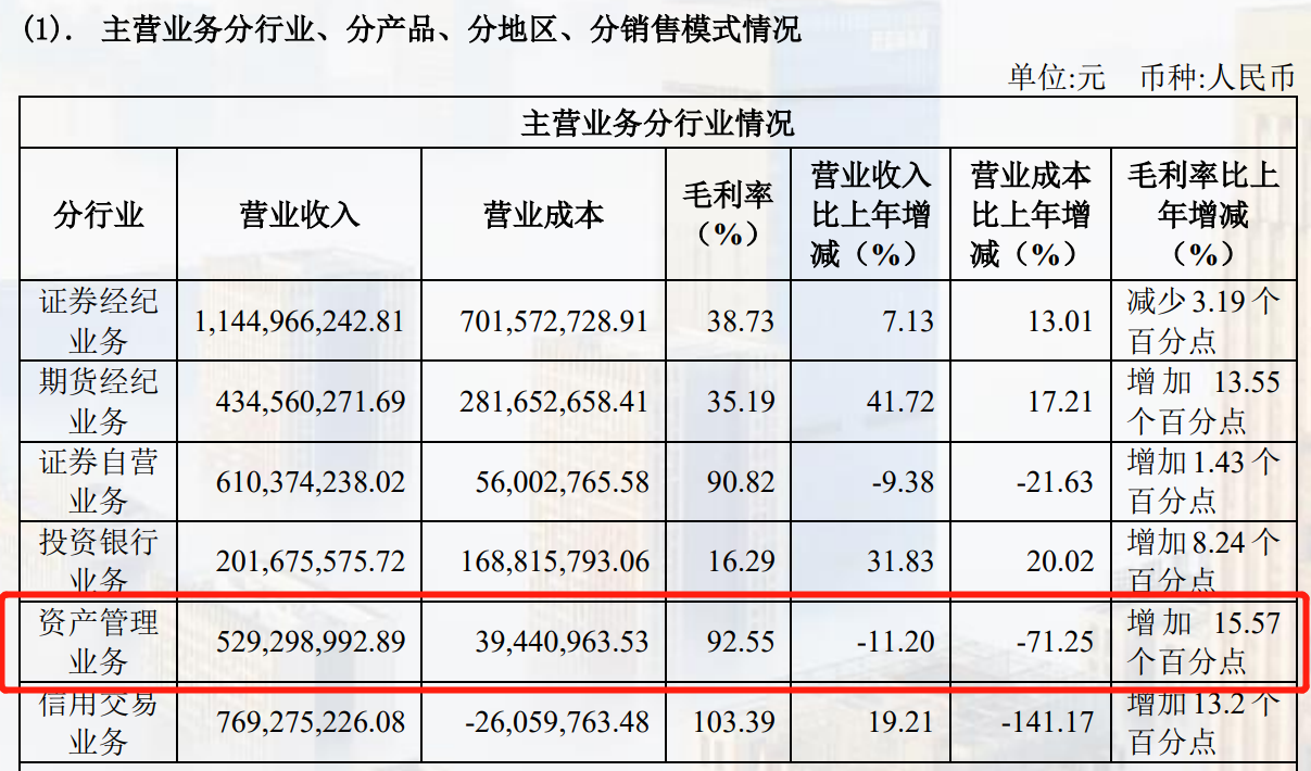 从营收构成来看,资产管理业务贡献营业收入5.29亿元,同比减少11.20%;营业成本0.39亿元,同比减少71.25%,毛利率92.55%,仅次于信用交易业务。