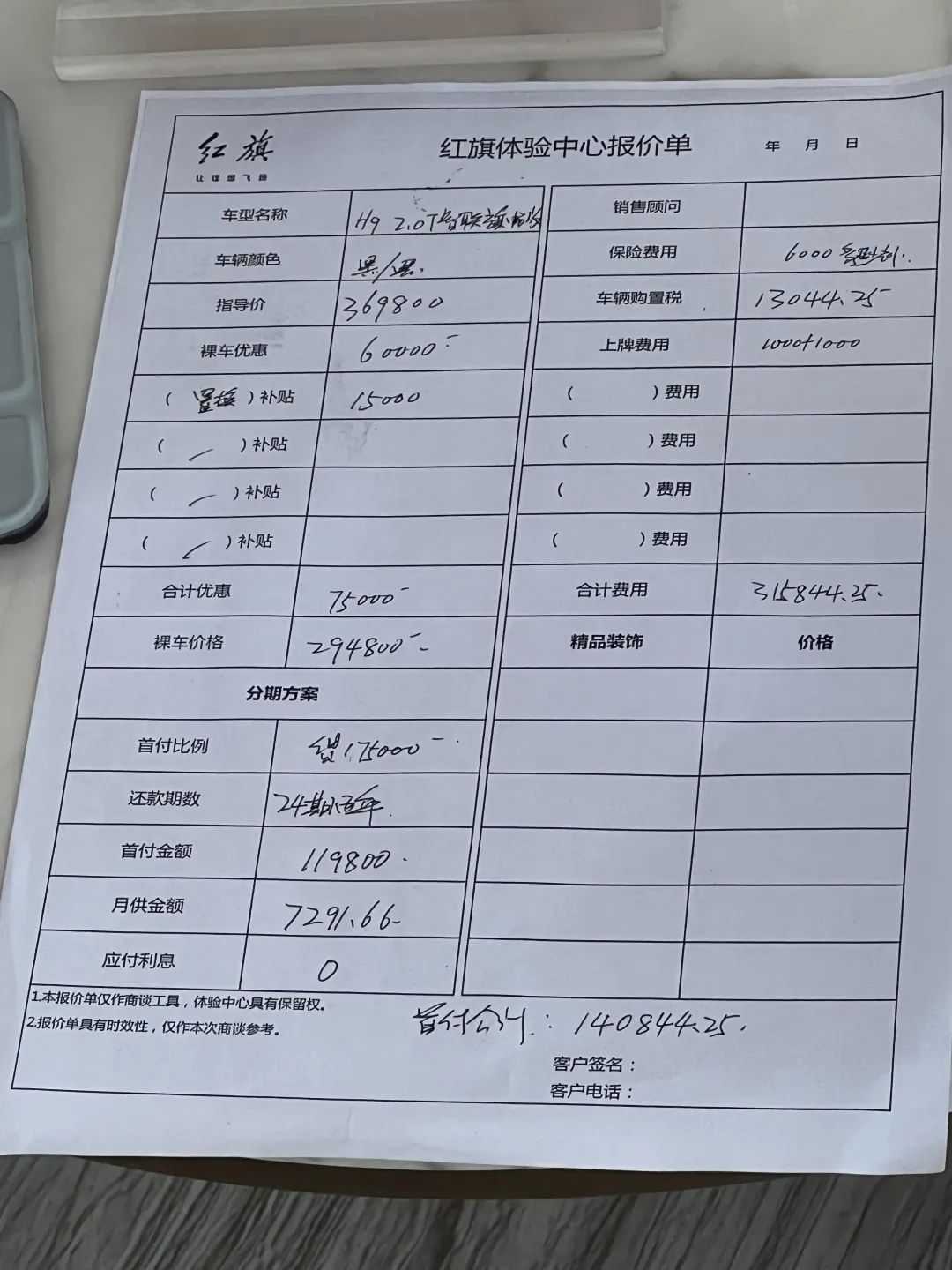 在给车市物语报价时,销售孙刚(化名)一上来就给出了“底价”。“红旗H9全系现金优惠6万元,另外送1.5万元置换补贴。也就是说,原价36.98万的2.0T动力版本顶配车型,算上购置税减征,落地价格才29.48万元。如果选择分期,我们现在也推出了0利率0手续费套餐,首付14万多您就能把车开走。”