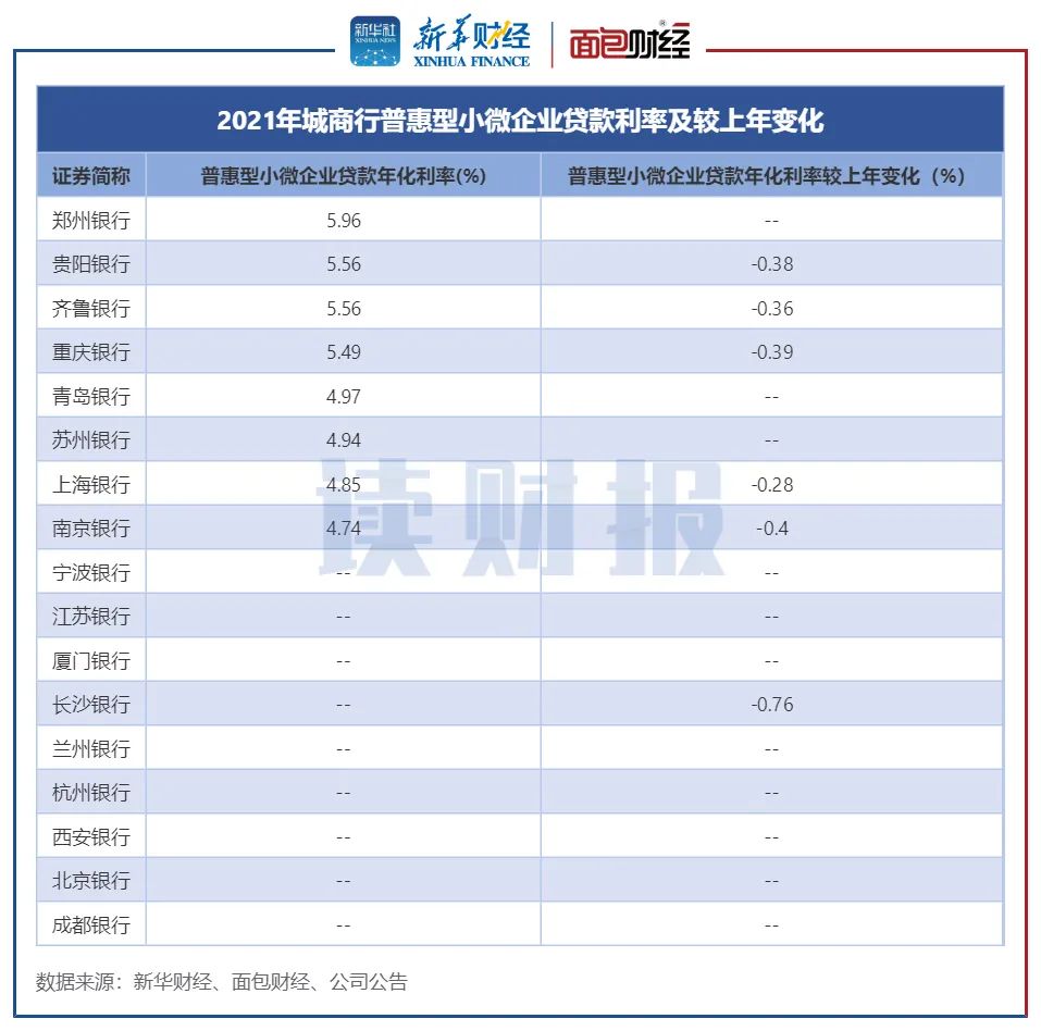 同时,部分城商行的小微企业贷款利率仍处在相对高位,郑州银行、贵阳银行和齐鲁银行三家银行普惠型小微企业贷款平均利率均超过5.5%,位居上市城商行前三名。