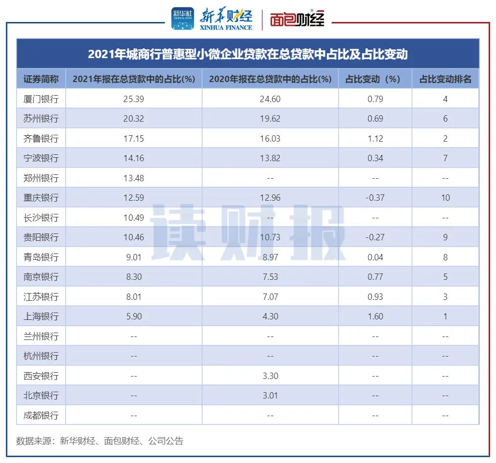 图2:2021年城商行普惠型小微企业贷款在总贷款中占比及占比变动