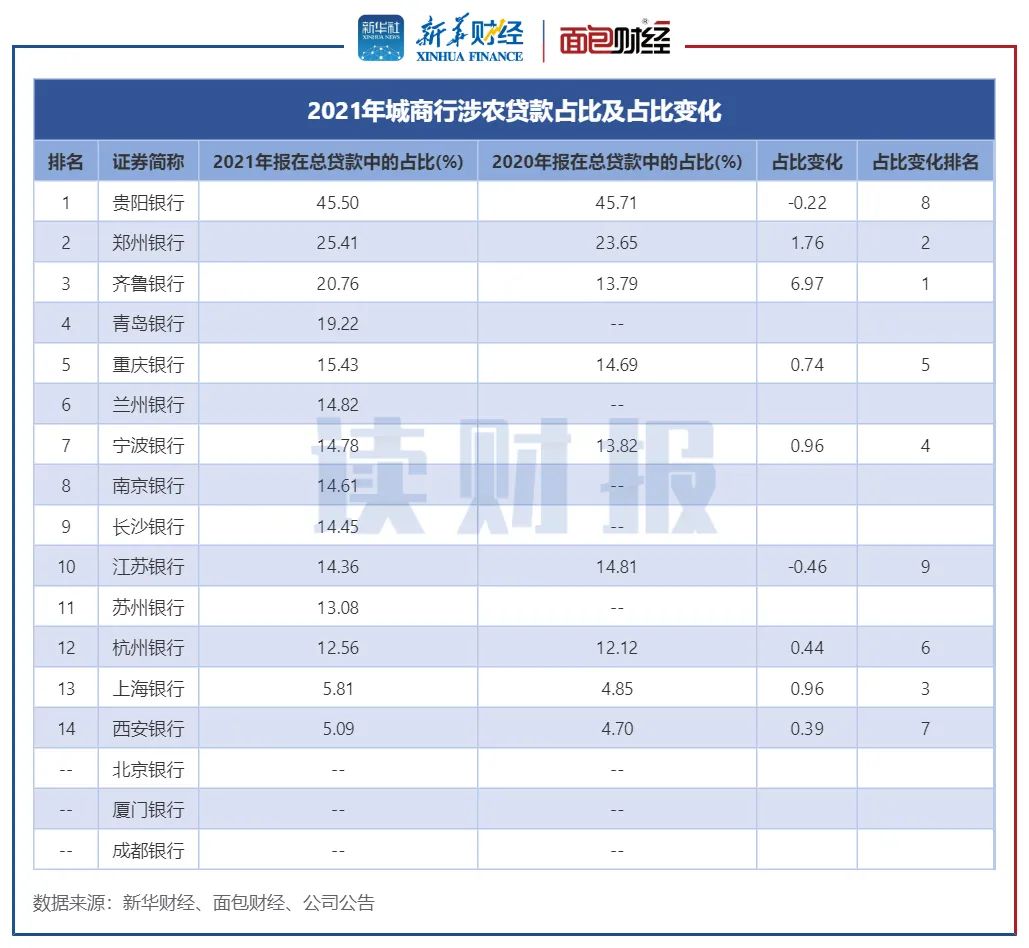 从占比变化来看,除贵阳银行及江苏银行占比有所微降外,其他城商行涉农贷款占比普遍微增。其中,齐鲁银行增幅较大,其涉农贷款较上年上升了6.97个百分点。