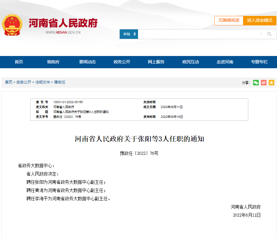 河南省人民政府发布一批人事任职通知,涉及河南省政务大数据中心。