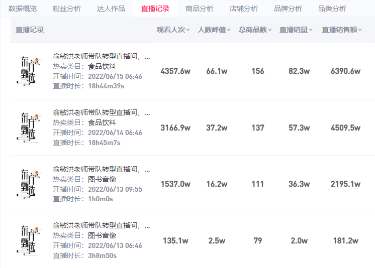 根据灰豚数据,6月15日东方甄选直播时长近19小时,各项数据再创新高,观看人次突破4000万,GMV超6000万。