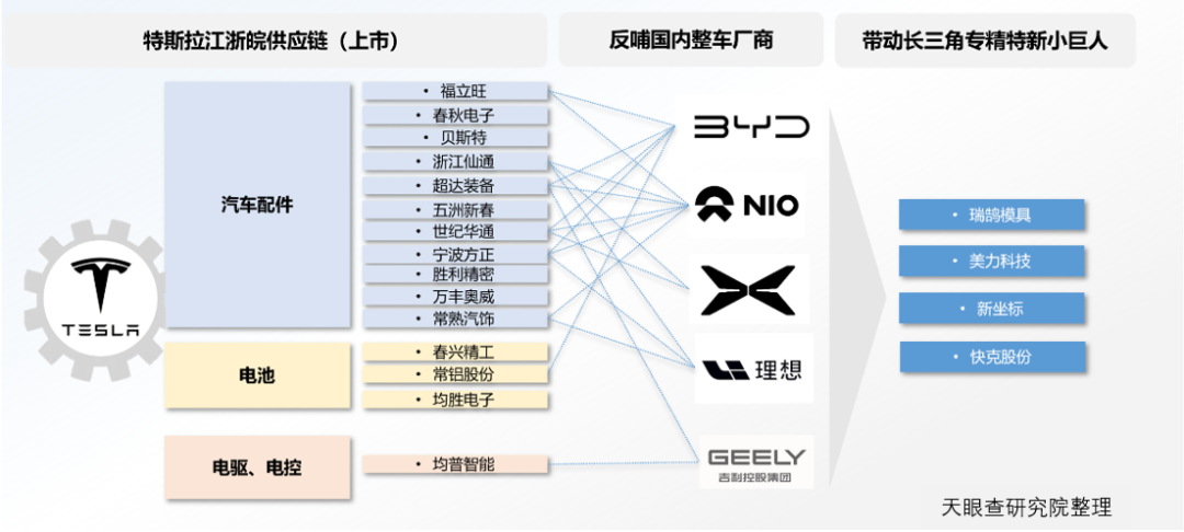 特斯拉2019年初落户临港,先后引入江苏、浙江、安徽的15家汽车零配件上市企业作为供应商,涉及电池管理系统、汽车零配件等产业链环节,例如,汽车内饰零配件企业福立旺(为蔚来、比亚迪供货),汽车模具企业浙江仙通(为蔚来、理想、比亚迪供货),电池企业常铝股份(为比亚迪供货),电驱、电控企业均普智能(为吉利供货),以特斯拉的标准和市场,带动了这些汽车零配件企业实现高质量发展,并进一步推动了蔚来等整车厂的发展。